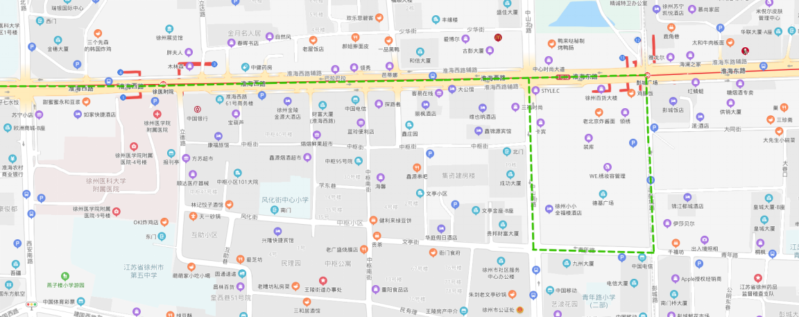 (2)??空军c:夾河高中(大彭鎮(zhèn))、大彭醫(yī)院、霸王山水泥廠、十八屯、徐州誠遠眼耳鼻喉醫(yī)院、雨潤新城、火花農(nóng)貿(mào)市場、生物工程學院北門、奎山散熱器公司、徐醫(yī)附院華豐分院、出入境辦理中心、小康人家、段南新村、段莊、礦務局、工人醫(yī)院、市二院、浦發(fā)銀行、彭城飯店、中央百大(單邊)。