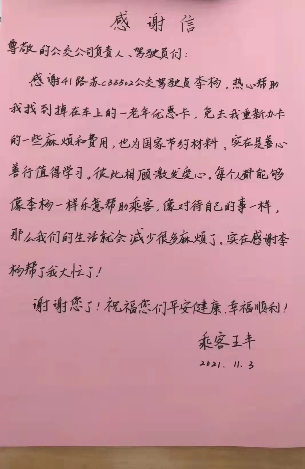 新區(qū)公司駕駛員李楊駕駛41路蘇C35502號(hào)車(chē),行駛至銀湖小區(qū)站臺(tái)時(shí),乘客王女士向其求助。王女士告訴駕駛員,早晨10點(diǎn)20分左右,她乘坐41路公交車(chē)時(shí),不慎將老年優(yōu)惠卡丟在了車(chē)上,希望李楊幫她尋找一下。李楊留下了王女士的電話,待車(chē)輛到達(dá)建筑學(xué)院后,李楊立即去調(diào)度室尋找,根據(jù)王女士提供的乘車(chē)時(shí)間很快鎖定了車(chē)輛,經(jīng)詢(xún)問(wèn),王女士的老年優(yōu)惠卡已被駕駛員交到了調(diào)度室妥善保管。11月3日下午,王女士取回了失而復(fù)得的老年優(yōu)惠卡,并送來(lái)感謝信。