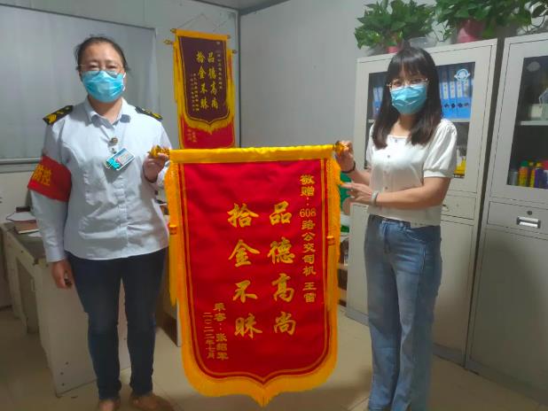 7月20日下午吳先生帶著一面“拾金不昧,品德高尚”的錦旗來到了巴士公司38調(diào)度室對駕駛員李倩倩表示感謝。