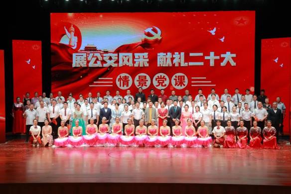 為激勵廣大黨員群眾以實際行動迎接黨的二十大勝利召開,8月10日下午,徐州公交集團(tuán)成功舉辦“展公交風(fēng)采 獻(xiàn)禮二十大”情景黨課。市交控集團(tuán)黨委委員、紀(jì)委書記胡濤,市交通運輸局宣傳教育處處長高夫健,徐州廣播電視傳媒集團(tuán)總編室主任劉建玲,市公交集團(tuán)外部董事,市交控集團(tuán)黨建工作部、群眾工作部部門領(lǐng)導(dǎo),以及公交集團(tuán)黨委班子成員、先進(jìn)勞模、職工代表共450余人出席并觀看演出。