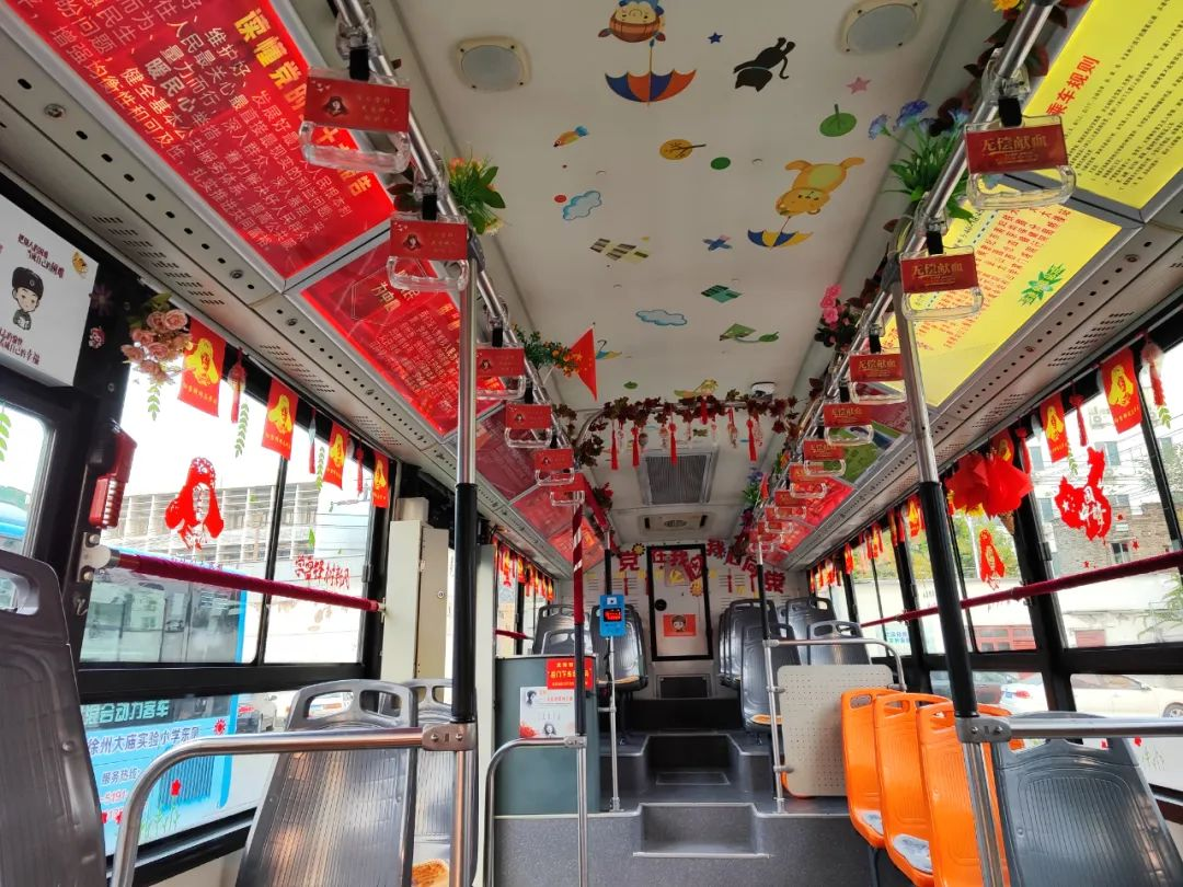 50余輛主題宣傳車車廂內(nèi)以中國紅為主色調(diào),在扶手、廣告展板、車廂尾部等醒目位置布置了黨的二十大報告內(nèi)容,還對黨的二十大報告以數(shù)讀、一圖速覽的形式,尤其是對二十大報告里黨的中心任務(wù)等重要提法、二十大報告金句等內(nèi)容做了重點展示。一幅幅主題鮮明、引人入勝的宣傳展板呈現(xiàn)在市民乘客面前,方便公交職工在工作間隙、廣大市民在乘車途中充分利用碎片時間學(xué)習(xí)黨的二十大精神。此外,部分公交車上還配置了便民服務(wù)箱,備有應(yīng)急藥品、口罩、消毒濕巾等,以實際行動踐行黨的二十大精神。