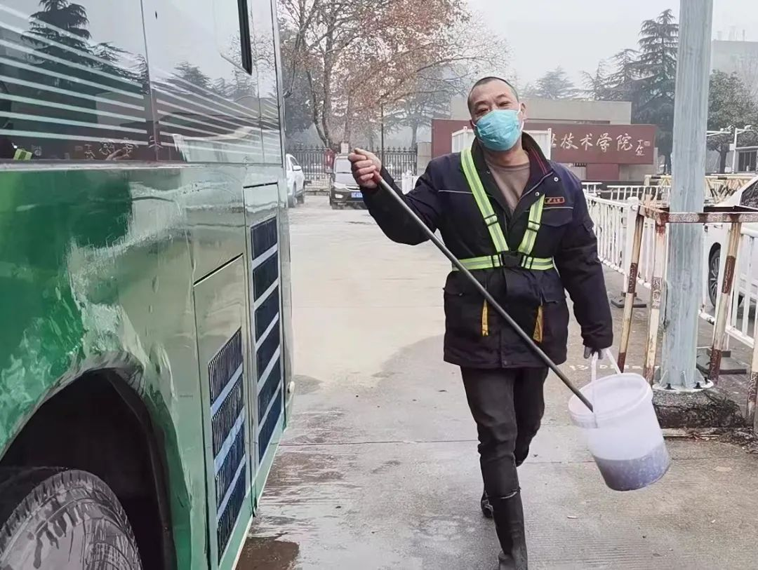 春運(yùn)期間,為保障廣大市民乘客出行需求,部分公交線路縮短了發(fā)車(chē)時(shí)間,增加了運(yùn)營(yíng)車(chē)輛,再加上客流增多,面擁堵等情況,公交車(chē)回到終點(diǎn)站停放的時(shí)間很短,又要投入到下一趟的運(yùn)營(yíng)當(dāng)中,這無(wú)疑給車(chē)輛保潔工作帶來(lái)了一定的困難。因此,為確保出場(chǎng)車(chē)輛干凈整潔,每天天沒(méi)亮,張璞已經(jīng)在建筑學(xué)院停車(chē)場(chǎng)里忙起來(lái)了。只見(jiàn)他一手拿毛刷,一手拎水桶,開(kāi)始清潔車(chē)廂外部,張璞動(dòng)作嫻熟地擦拭前擋風(fēng)玻璃、車(chē)廂外部?jī)蓚?cè),不一會(huì),他的臉上就已掛滿了汗珠,平均一輛車(chē)10分鐘的清潔時(shí)間,是他十多年工作鍛煉出來(lái)的速度。近日氣溫驟降,持續(xù)有冰凍天氣,如果抹布太濕,早晨擦座椅時(shí)會(huì)粘在上面,為張璞都會(huì)提前準(zhǔn)備好潮濕的抹布,既能擦掉扶手、座椅、靠背上的浮塵,還不會(huì)留下水漬。像這樣日復(fù)一日的簡(jiǎn)單工作,張璞堅(jiān)持了十多年,他平均每天要打掃23臺(tái)車(chē),平均一輛車(chē)10分鐘的清潔時(shí)間,張璞用自己的勞動(dòng),換來(lái)了車(chē)輛的干凈整潔。