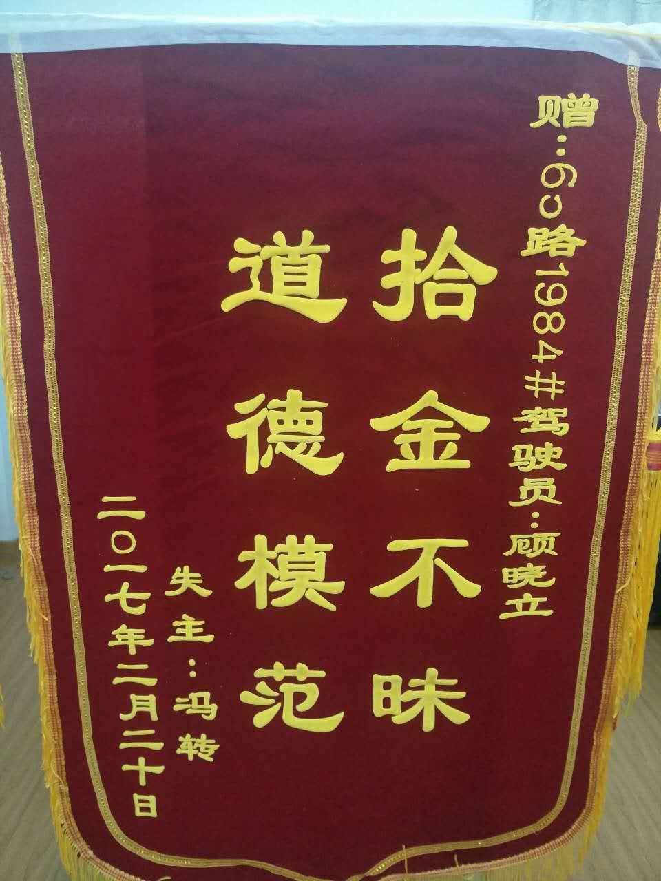 2月20日上午,乘客馮先生從第四人民醫(yī)院乘65路車(chē)到礦務(wù)局下車(chē)去兒童醫(yī)院給孩子看病,匆忙下車(chē)時(shí)把手提包丟在車(chē)上,當(dāng)時(shí)非常著急,內(nèi)有身份證兩張,銀行卡數(shù)張,由于丟失身份證不能給孩子辦理出院手續(xù),焦急萬(wàn)分。65路1984號(hào)車(chē)駕駛員顧曉立拾到后,妥善保管,交還馮先生。馮先生十分感謝,特送來(lái)錦旗一面,并撥打12345表?yè)P(yáng)。