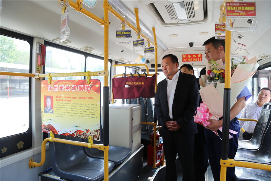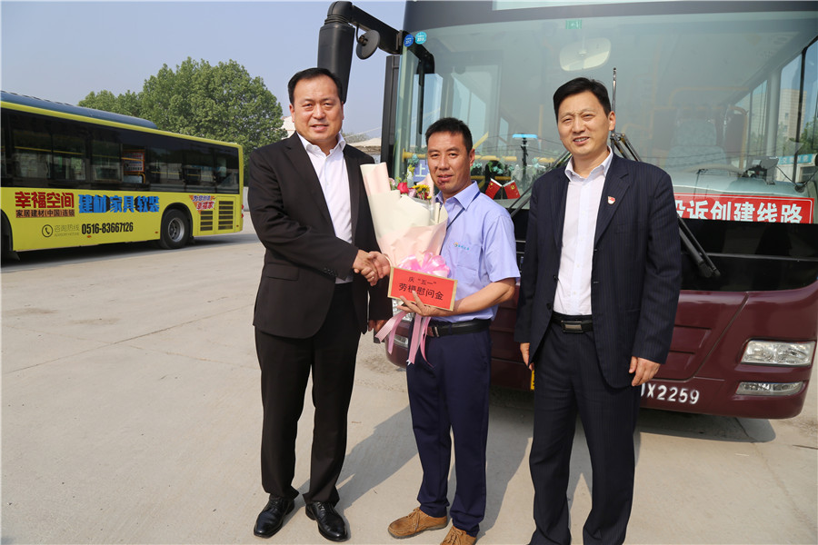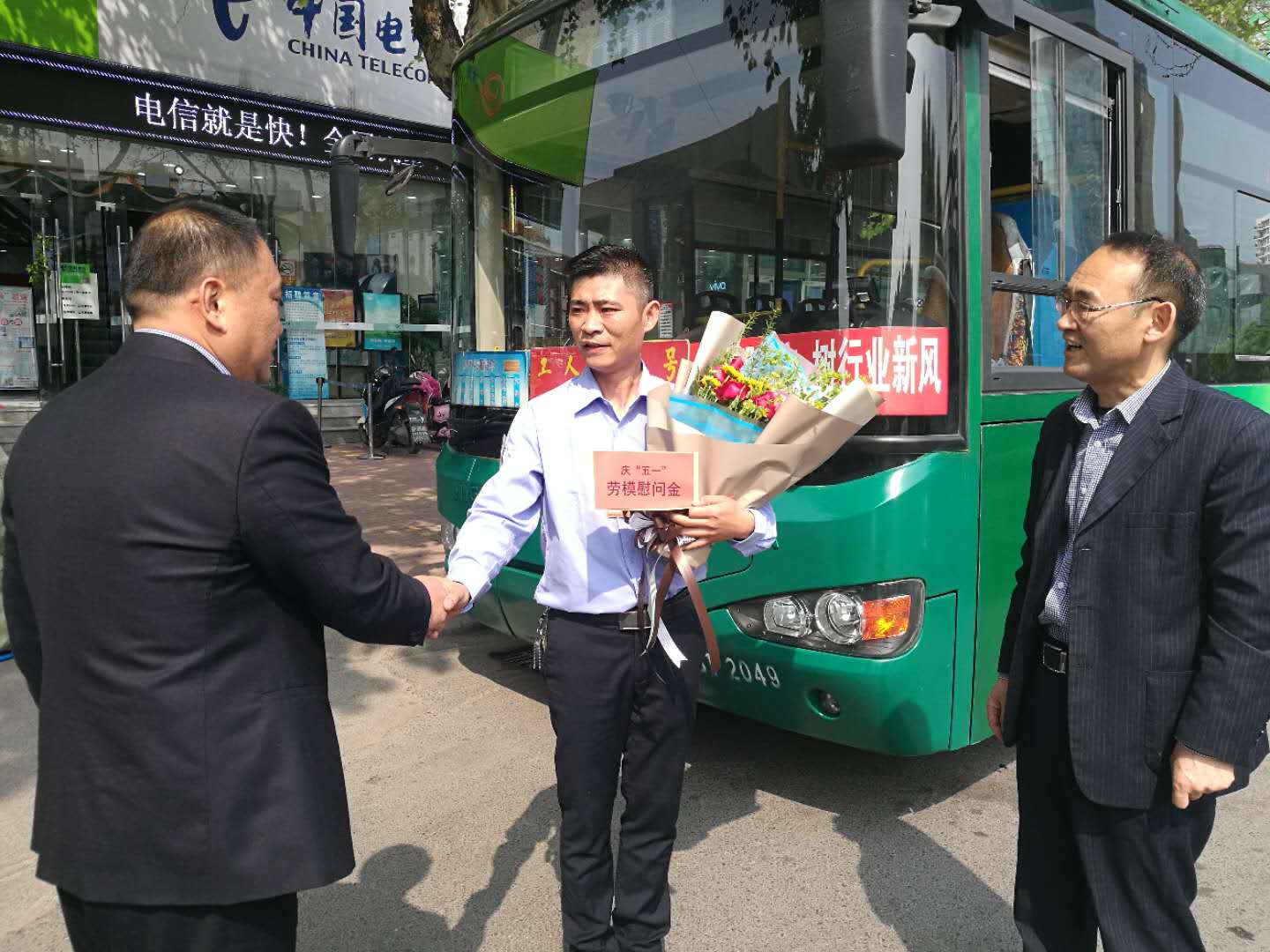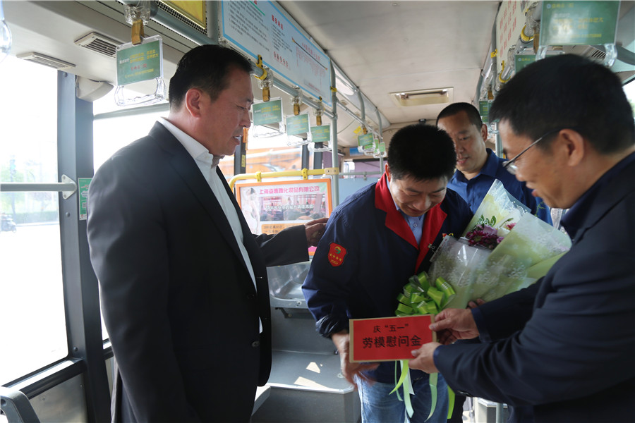 杜紅軍一行首先來到韓山終點(diǎn)站,剛行駛完一趟的市勞模、49路線駕駛員王博正利用休停時間打掃車輛,杜總走上前親切地與王博握手,并把一束嬌艷芬芳的鮮花和勞模慰問金送到他手中。